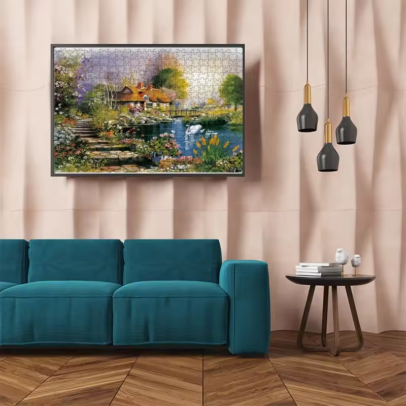 This puzzle showcases a charming countryside scene centered around a cozy thatched-roof cottage surrounded by lush gardens. A stone pathway winds through blooming flowers toward a calm pond, where white swans glide across the water. Soft sunlight, pastel tones, and delicate trees in the background give the artwork a peaceful, painterly atmosphere reminiscent of a storybook landscape.
